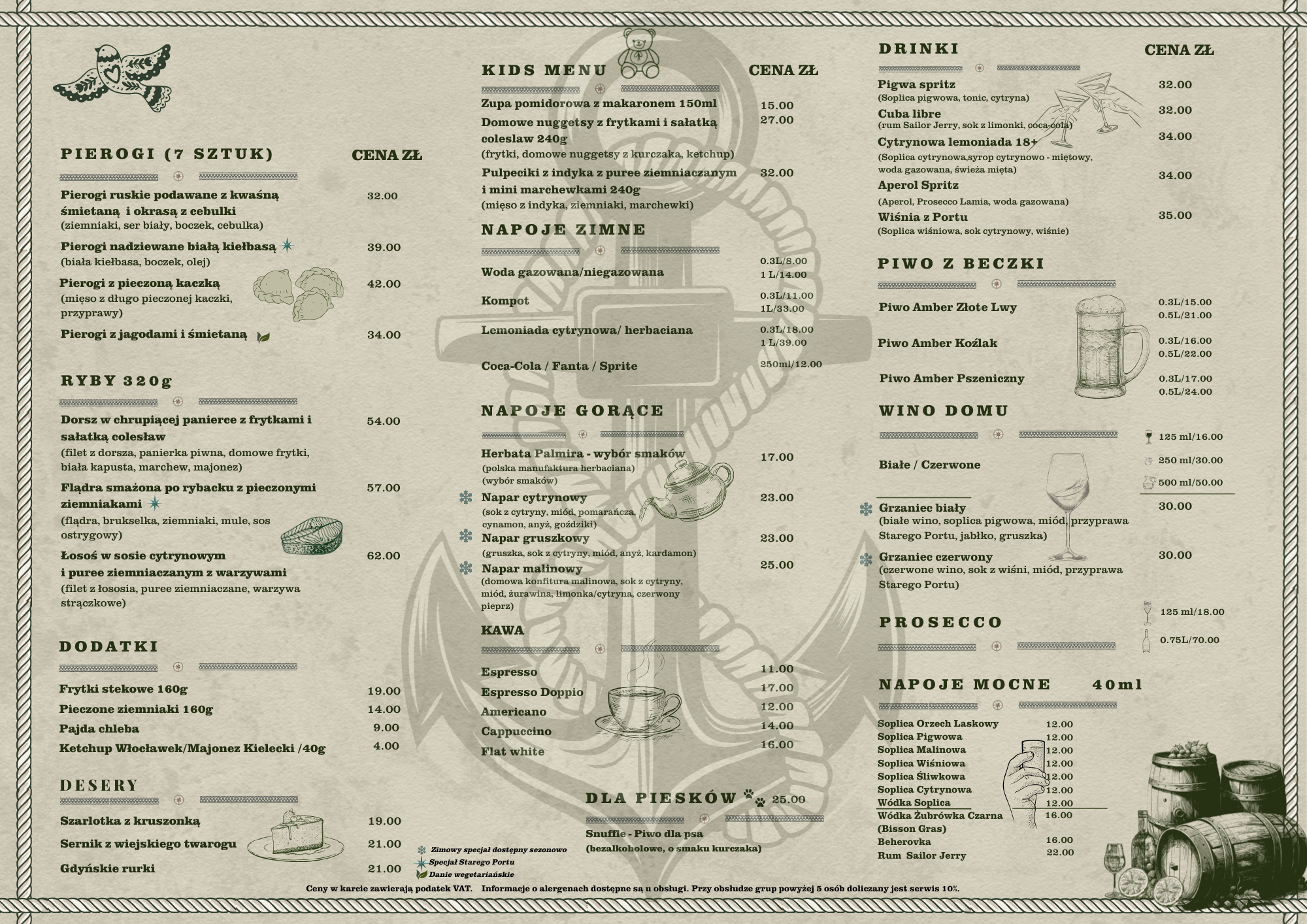 Wnętrze karczmy buduje wyjątkową atmosferę – na ścianach prezentujemy archiwalne fotografie udostępnione przez Muzeum Miasta Gdyni, które opowiadają historię portu, pierwszych mieszkańców i morskiej tożsamości miasta. To nie tylko restauracja, ale także miejsce, w którym można poczuć ducha dawnej Gdyni.